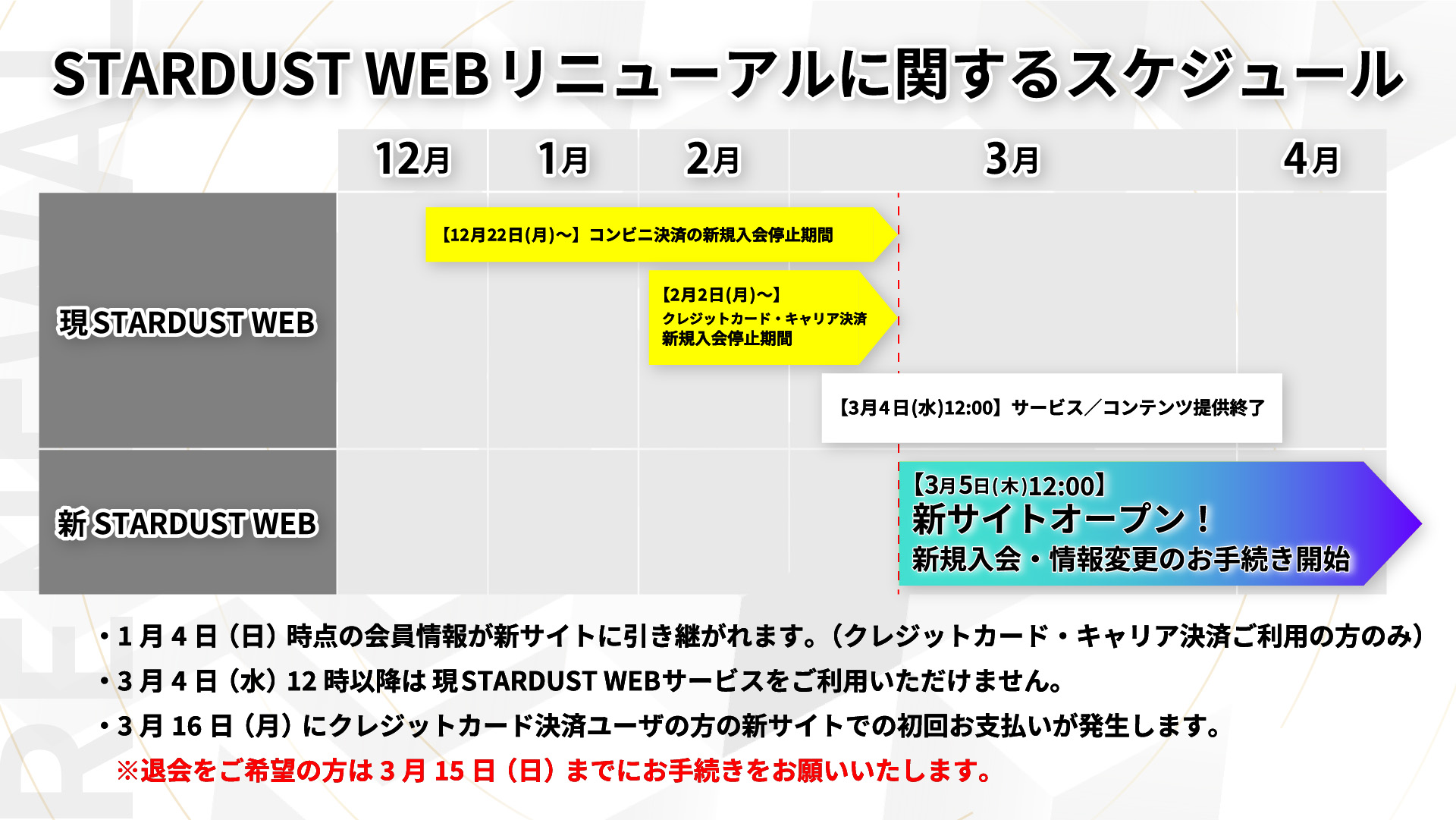 2026年1月4日(日) 23:59時点でSTARDUST WEBに有料会員登録されている方の情報は新サイトへ自動的に引き継がれます。
